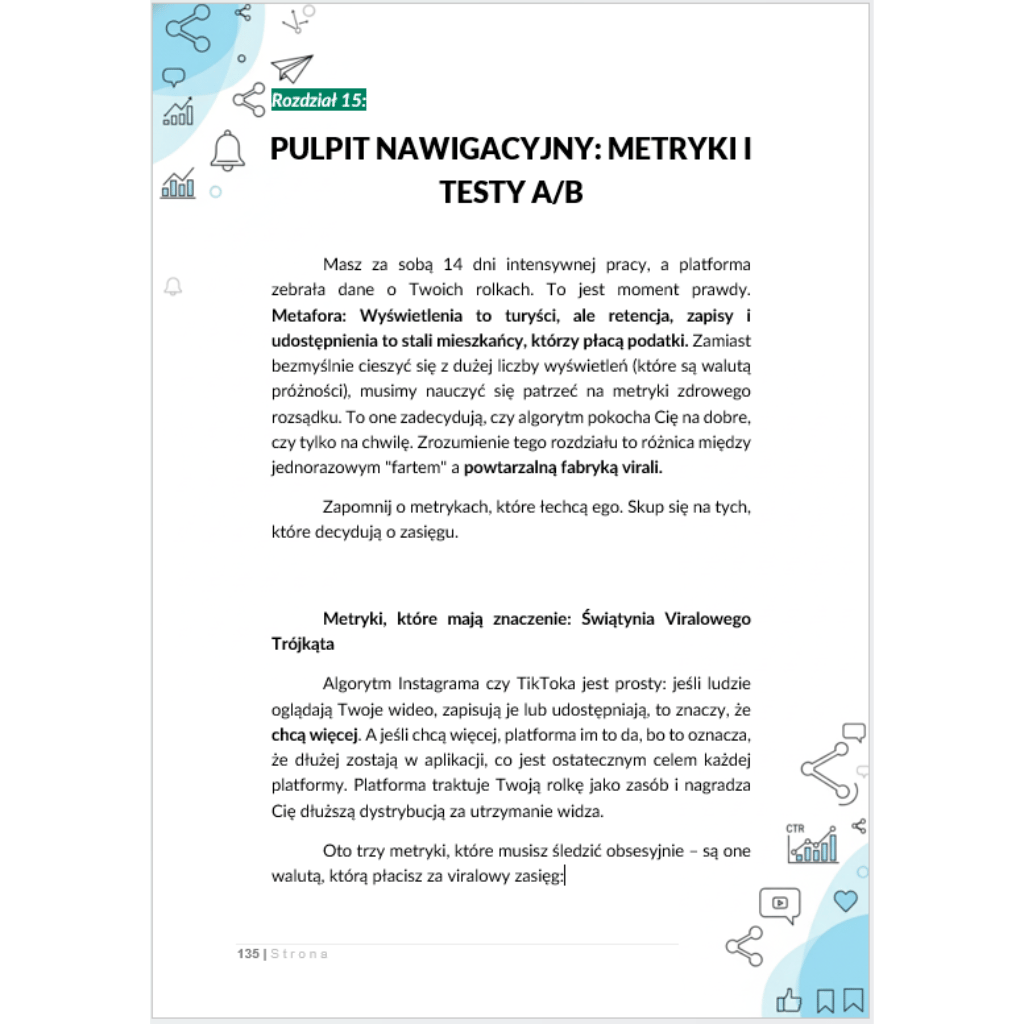 Masz wrażenie, że krzyczysz do pustego pokoju? Rzucasz rolkę, robisz znak krzyża i… cisza. Ten e-book rozbiera virale na czynniki pierwsze jak chirurg – bez mitów o „magii algorytmu” i bez porad typu „po prostu bądź sobą”. Zobaczysz, dlaczego trzy pierwsze sekundy są jak bramka bezpieczeństwa na lotnisku (albo przechodzisz, albo zawracasz), jak działa krzywa retencji i gdzie dokładnie uciekają widzowie. Dostaniesz praktyczne haki uwagi i pattern interrupts, które nie pachną clickbaitem, tylko precyzją: rytm montażu zszyty z muzyką, napisy dopasowane do tempa czytania, mikro-storytelling w piętnastu klatkach. Zamiast zgadywać, nauczysz się mierzyć: progi, które trzeba przebić, by rolka dostała drugi oddech w dystrybucji – i jak do tych progów dowieźć treścią, a nie desperacją.