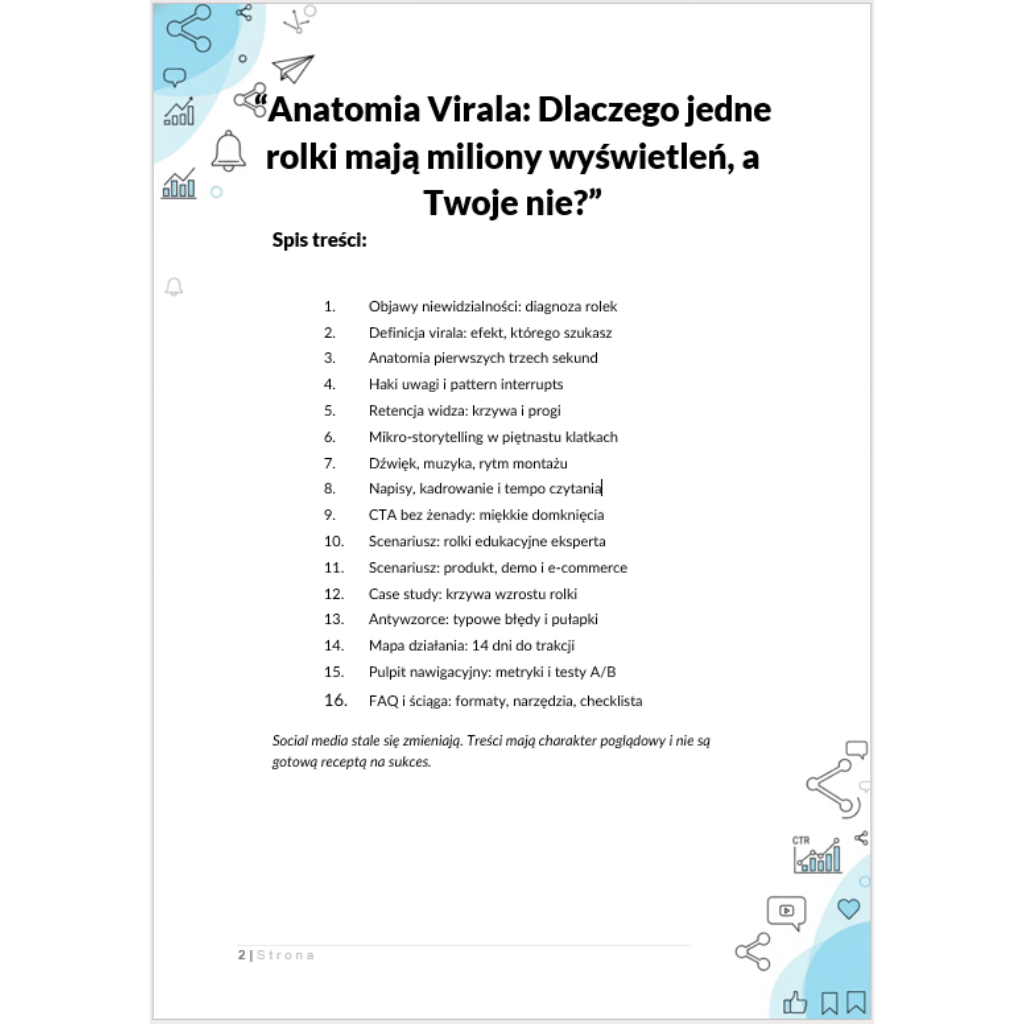 To nie jest „zbiór inspiracji”, tylko system produkcyjny. Od razu wejdziesz w tryb testów A/B, z gotowym pulpitem metryk i 14-dniową mapą działania, która wymusza postęp. Pokażę Ci, jak tworzyć edukacyjne rolki eksperta, które budują autorytet bez wykładu; jak sprzedawać produkt w 30 sekund bez żenady (miękkie domknięcia, które działają), oraz jak czytać krzywą wzrostu, by dołożyć paliwa dokładnie wtedy, gdy algorytm uchyla drzwi. Antywzorce? Będziesz je widzieć z kilometra: przeładowanie bodźcami, źle ustawione tempo, captions, które wywołują panikę oka. Po lekturze Twoje wideo przestaje liczyć na łut szczęścia – zaczyna działać według powtarzalnej anatomii.