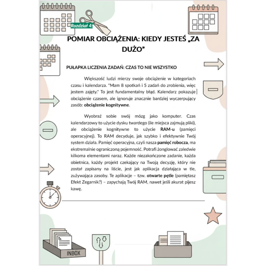 Jesteś zmęczony byciem „ciągle zajęty”, a w środku dnia i tak nie wiesz, co naprawdę posuwa Cię do przodu? Ten e-book to prosty przewodnik, jak przestać kręcić się w kółko. Pokażę Ci, jak rozpoznać „śmieciowe zadania”, które zjadają czas i energię, oraz jak wybrać jedną najważniejszą rzecz dziennie — bez wyrzutów sumienia, że reszta poczeka. Nie ma tu wielkich teorii: tylko jasne zasady, krótkie checklisty i gotowe zdania do odmawiania spotkań, maili i „na chwilkę”. Dzięki temu odetchniesz, uporządkujesz kalendarz i poczujesz, że masz kontrolę.
