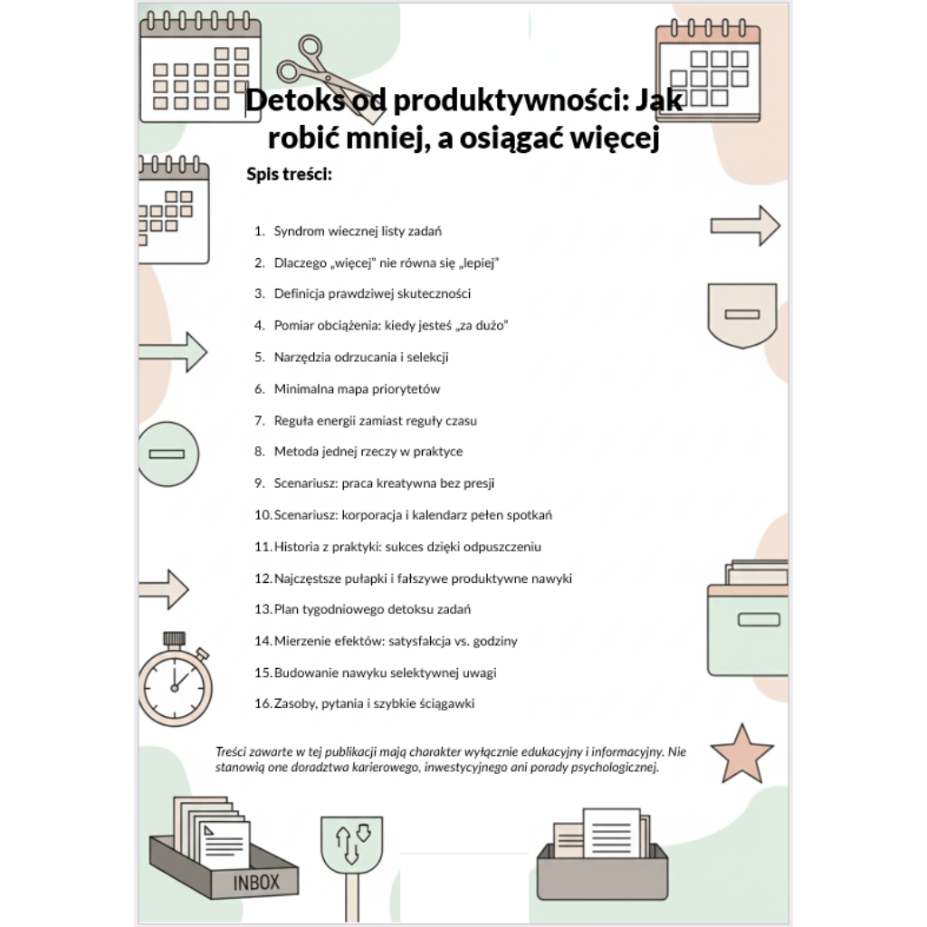 „Detoks od produktywności” uczy też pracy pod energię, a nie pod zegar. Zamiast ścigać się z czasem, nauczysz się układać dzień tak, by najtrudniejsze rzeczy robić, gdy masz moc, a lżejsze — gdy spadasz z sił. Dostaniesz proste scenariusze dla pracy twórczej (jak działać bez presji, ale z efektem) i dla korpo-kalendarza pełnego spotkań (jak odzyskać bloki skupienia). Do tego tydzień ćwiczeń „odchudzających” listę zadań, krótka historia, w której wynik przyszedł dopiero po odpuszczeniu, i szybkie narzędzia do mierzenia efektów nie tylko godzinami, ale satysfakcją.