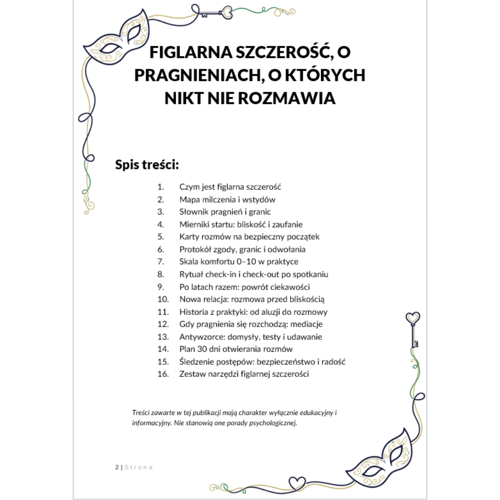 Zamiast kolejnej „teorii relacji” dostajesz praktyczny zestaw narzędzi: mapę milczenia i wstydów, słownik pragnień i granic, skalę komfortu 0–10, protokół zgody i odwołania, rytuał check-in/check-out po spotkaniu. Nauczysz się ustawiać bezpieczne ramy — w nowej relacji przed pierwszą bliskością oraz po latach razem, kiedy ciekawość przygasła. Zobaczysz na żywo historię „od aluzji do rozmowy”, a także ścieżkę mediacji, gdy pragnienia się rozchodzą. Bez gierek, bez testowania partnera, bez udawania — z mocą jasnych słów, które niosą zaufanie.