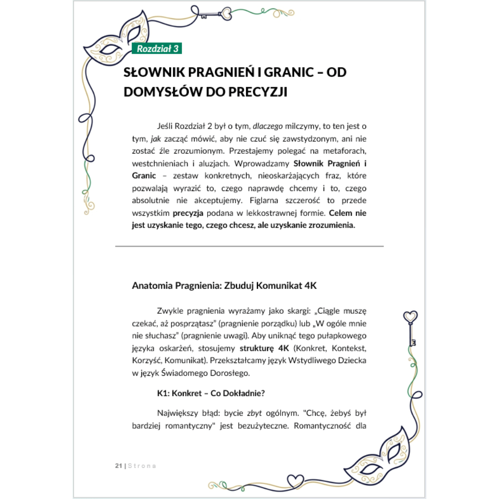 Masz w sobie pragnienia, których nigdy nie wypowiedziałeś/aś na głos — nie dlatego, że są „złe”, tylko dlatego, że nikt nas nie uczy, jak o nich mówić. Ten ebook jest odważnym przewodnikiem po terytorium milczenia: pokaże, gdzie wstyd podcina skrzydła bliskości, jak nazwać to, co krąży w głowie, i jak przejść od aluzji do rozmowy, która naprawdę zbliża.