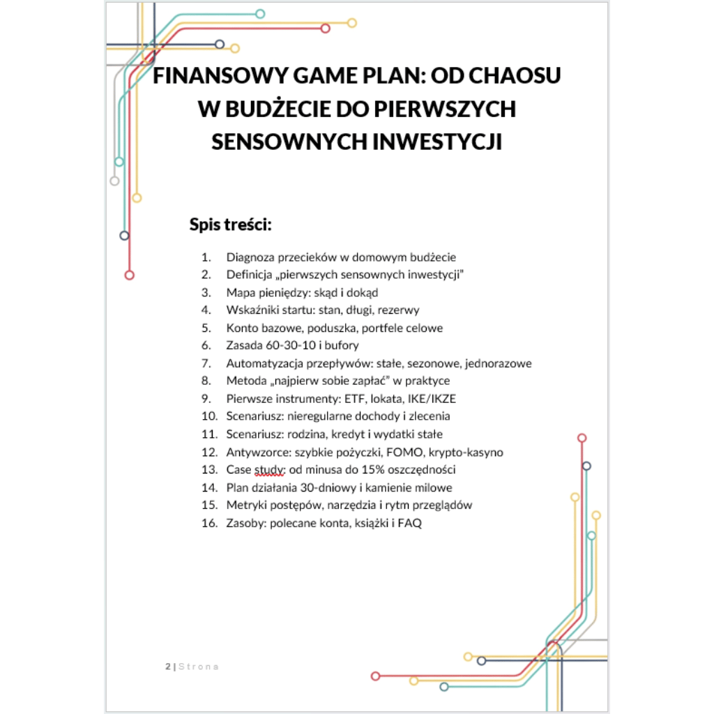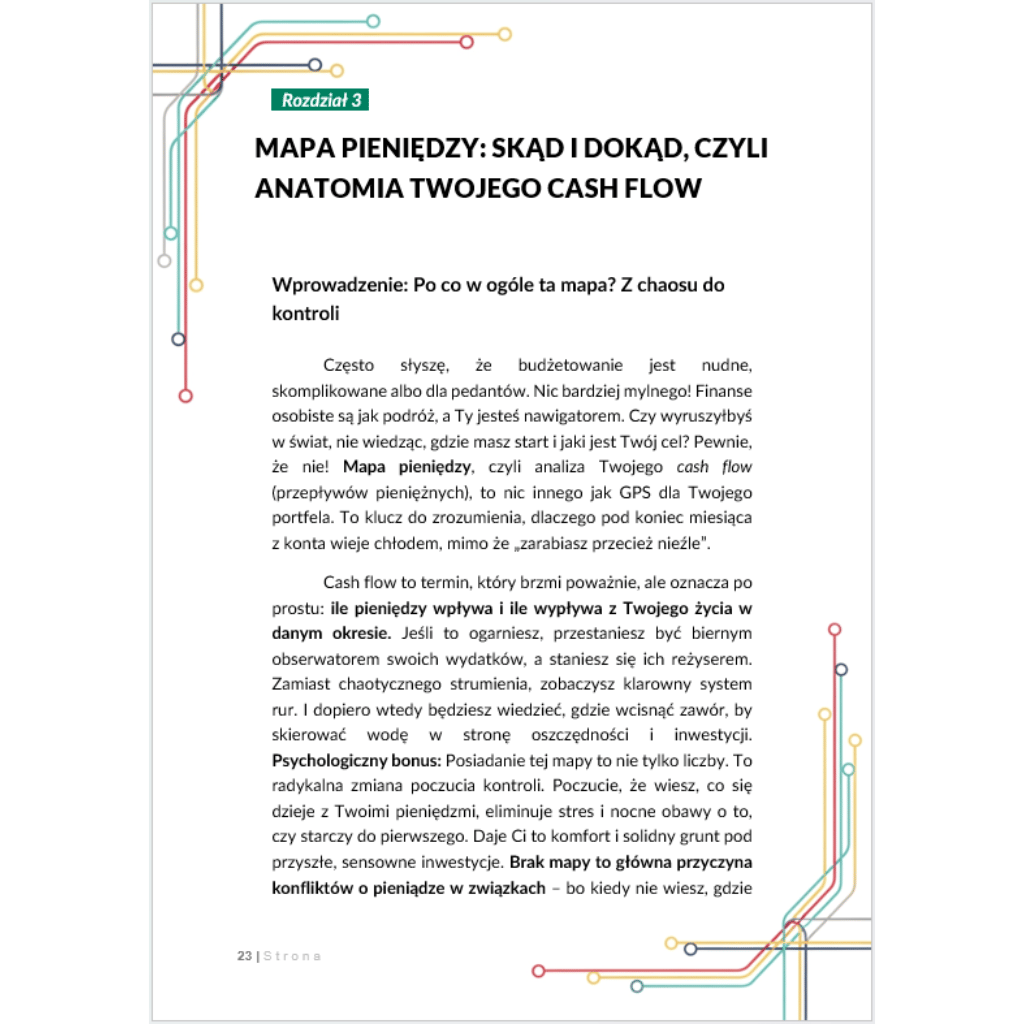 Druga połowa to start inwestycyjny bez kasyna i wstydu przed giełdowym żargonem. Zamiast emocji – algorytm: kiedy lokata, kiedy ETF, gdzie sens ma IKE/IKZE i jak nie dać się FOMO, szybkim pożyczkom i „gorącym tipom”. Dostajesz scenariusze dla nieregularnych dochodów i dla rodziny z kredytem, case „od minusa do 15% oszczędności”, a na koniec 30-dniowy plan z kamieniami milowymi oraz prostymi metrykami postępu. Zero magii. Samonapędzający się system, który robi robotę także wtedy, gdy Ty zajmujesz się życiem.