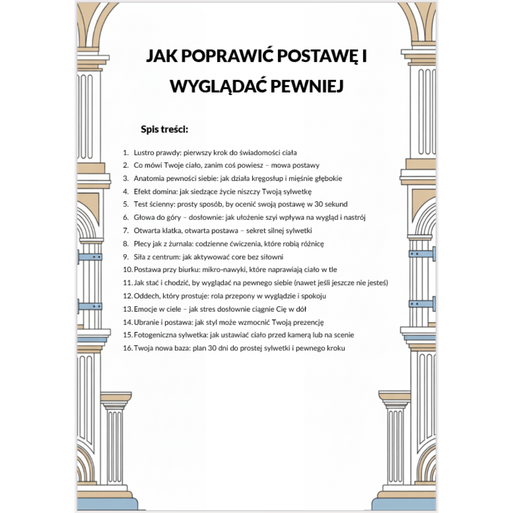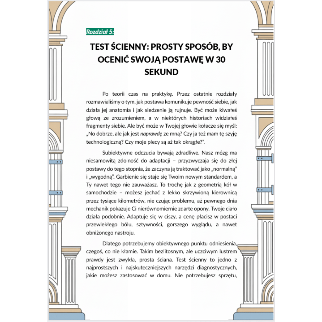 To nie jest książka o „idealnym staniu”. To plan na realną zmianę, która przenosi się na scenę, rozmowę rekrutacyjną, randkę i codzienny spacer do sklepu. Pokażę Ci, gdzie uciekają centymetry wzrostu (i charyzmy), jak zresetować „siedzące” ciało w minutę, jak włączyć rdzeń bez siłowni i co zrobić, by aparaty i lustra „lubiły” Twoją sylwetkę. Zrozumiesz, dlaczego stres dosłownie ściąga Cię w dół — i jak jednym, świadomym ustawieniem barków oraz szyi odblokować oddech, energię i spokój. A na koniec dostajesz 30-dniową bazę: krótki, skalowalny plan, który buduje nawyk prostej postawy i pewnego kroku — bez spiny, bez wymówek, z widocznymi rezultatami.