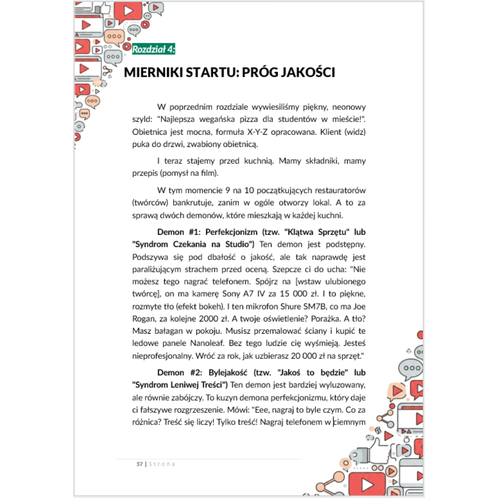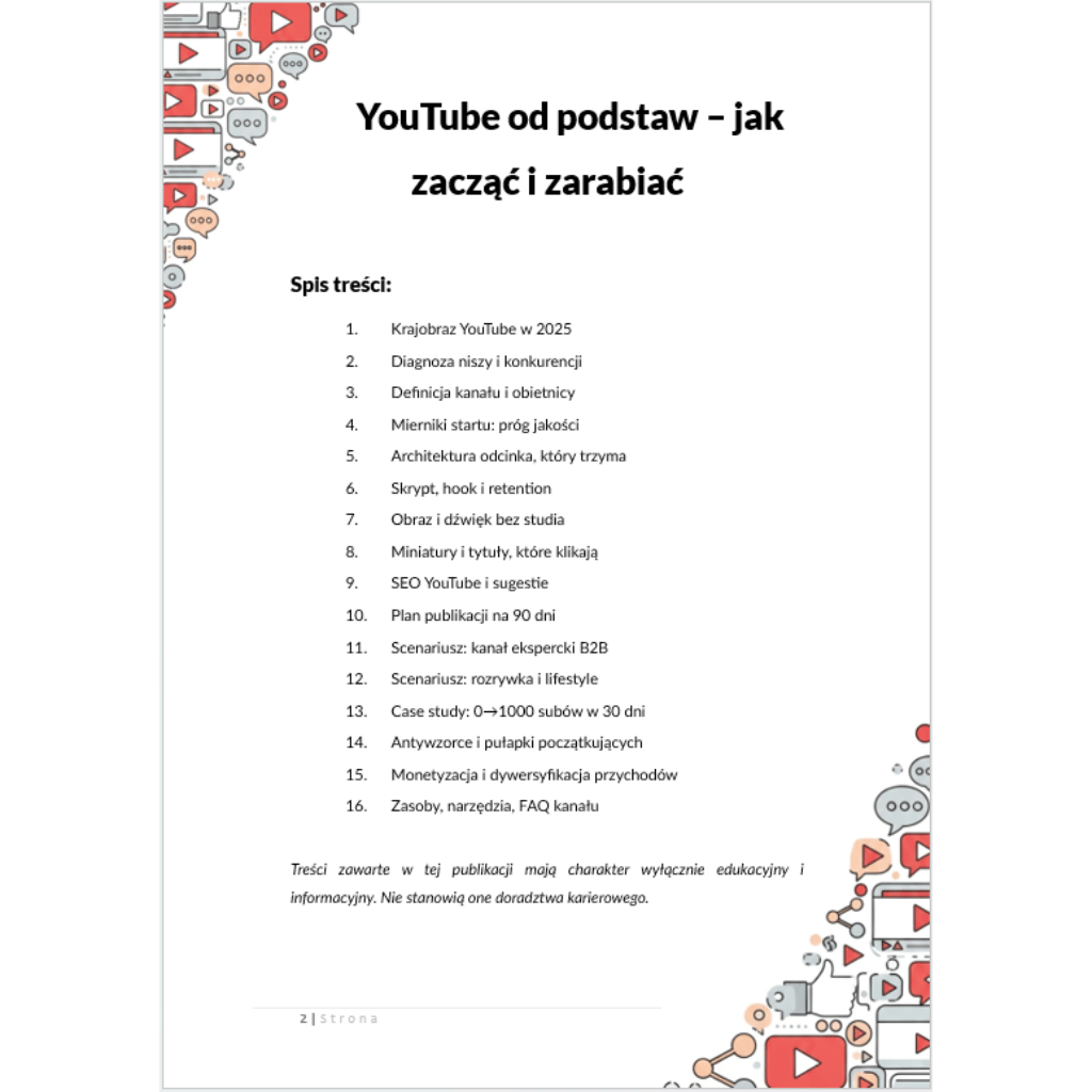 To nie jest miły poradnik do kawy. To taktyczny blueprint: plan publikacji na 90 dni, dwie gotowe ścieżki (B2B i lifestyle), realne case study 0→1000 subów w 30 dni oraz mapa min, na które wszyscy początkujący wchodzą — żebyś Ty nie musiał. Nauczę Cię traktować YouTube jak rynek, nie galerię: treść ma pracować w weekendy, a kanał ma zarabiać nawet, gdy Twój telefon jest w trybie samolotowym. Monetyzacja nie kończy się na AdSense — to tylko napiwek. Prawdziwy przychód bierze się z produktów, ofert i partnerstw, które wpasowują się w Twoją niszę jak klucz w zamek. Zamykasz e-booka i wiesz: co nagrywasz jutro, jak to opakujesz, gdzie to wyląduje i ile może zarobić.